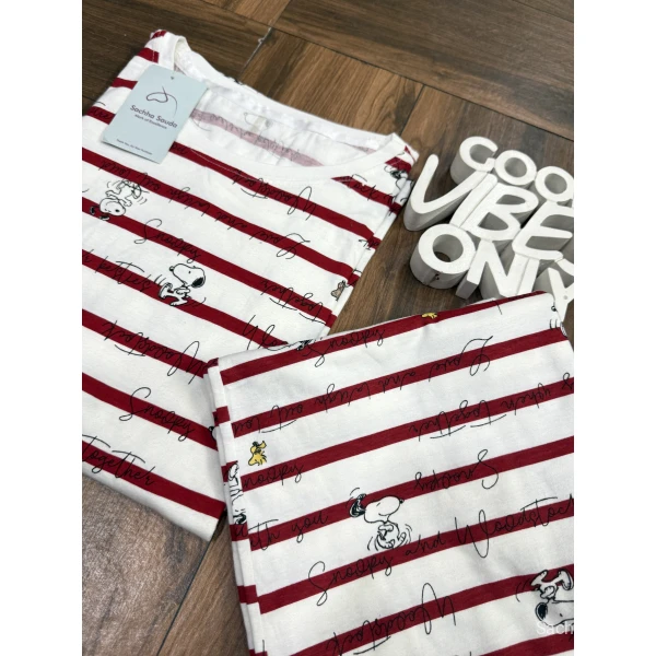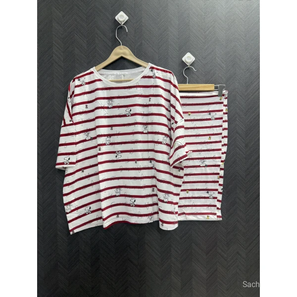 This cute and trendy nightwear set features a Snoopy print with red stripe pattern. Crafted from premium cotton hosiery fabric, it ensures softness, breathability and all-night comfort.