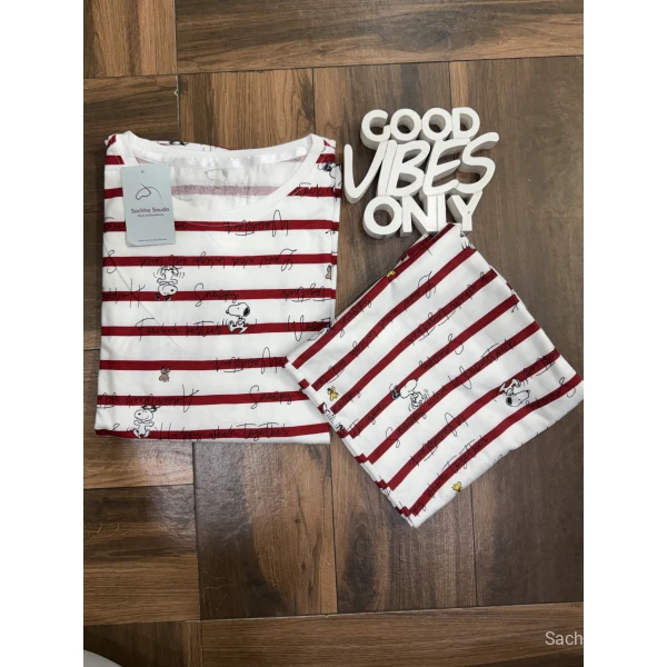This cute and trendy nightwear set features a Snoopy print with red stripe pattern. Crafted from premium cotton hosiery fabric, it ensures softness, breathability and all-night comfort.